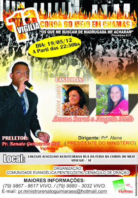Será realizada no sábado, 19 de Maio, a partir das 22h30, no bairro Coroa do Meio uma poderosíssima vigília contando com a pregação do Pr Renato Guimarães (SP) e a Prª Alene e a apresentação das cantoras Lenna Sarai e Ãngela Melo. O evento Gospel é uma organização da Comunidade Evangélica Pentecostal Cenáculo de Oração e acontecerá no Colégio Juscelino Kubstchek (Rua da feira da Coroa do Meio). Voce não pode perder a 1ª Vigília Coroa do Meio em chamas.